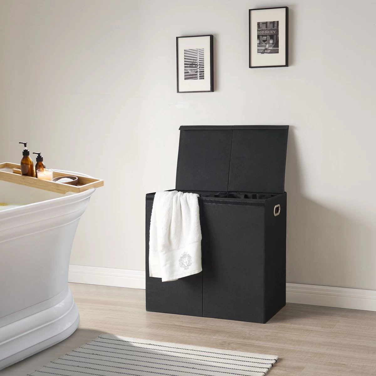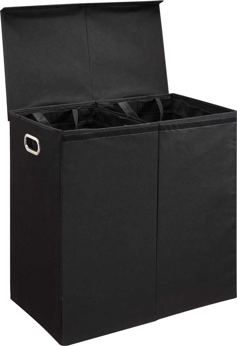 De wasmand is volledig gemaakt uit stof met twee uitneembare zakken zodat je deze gemakkelijk kan optillen door middel van de daarvoor voorziene handvaten. De zwarte kleur geeft de wasmand een neutrale en klassieke uitstraling.