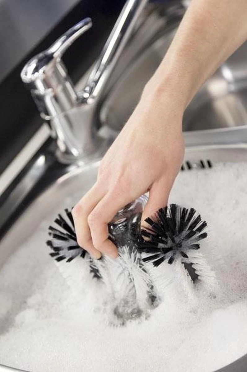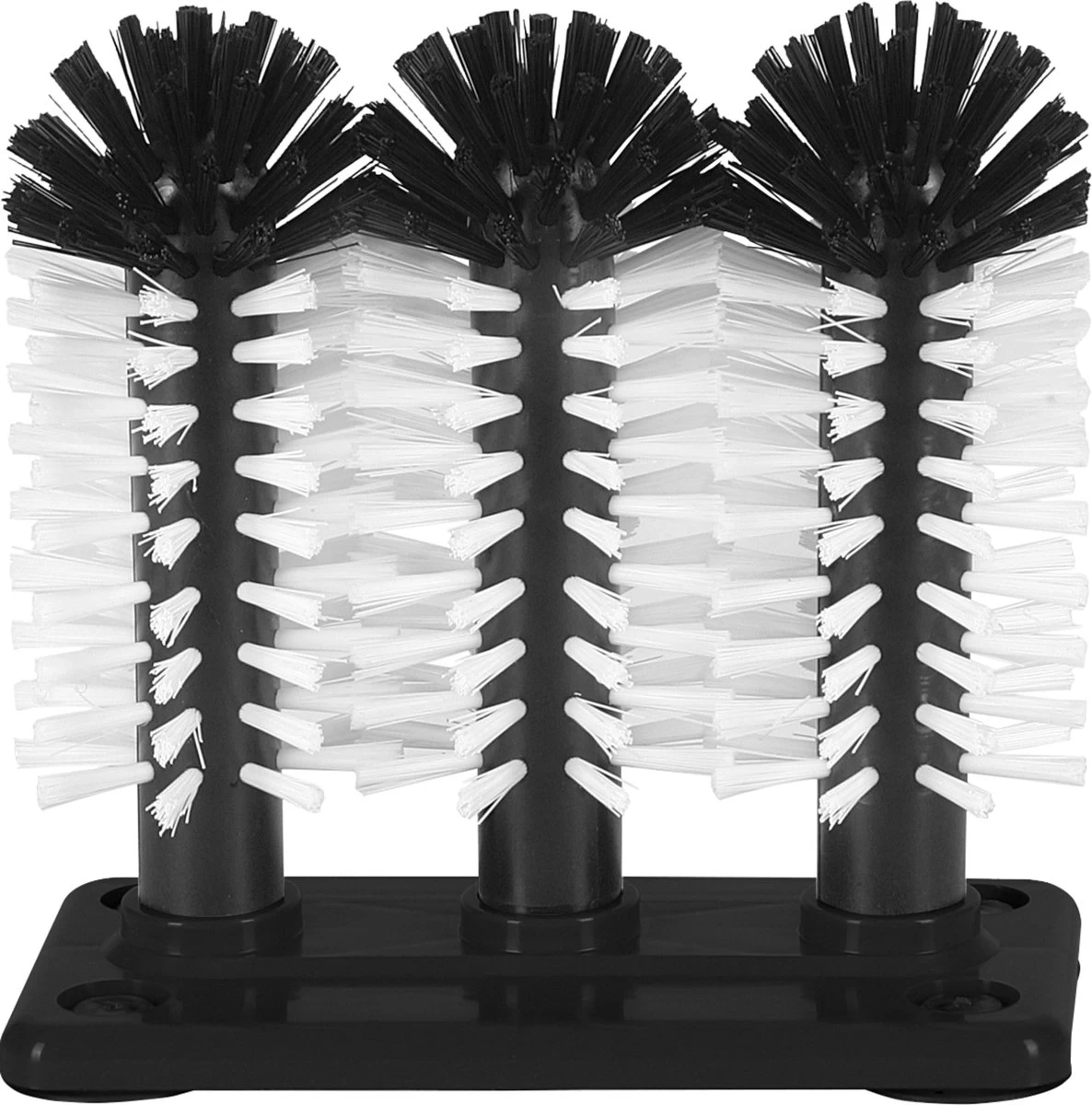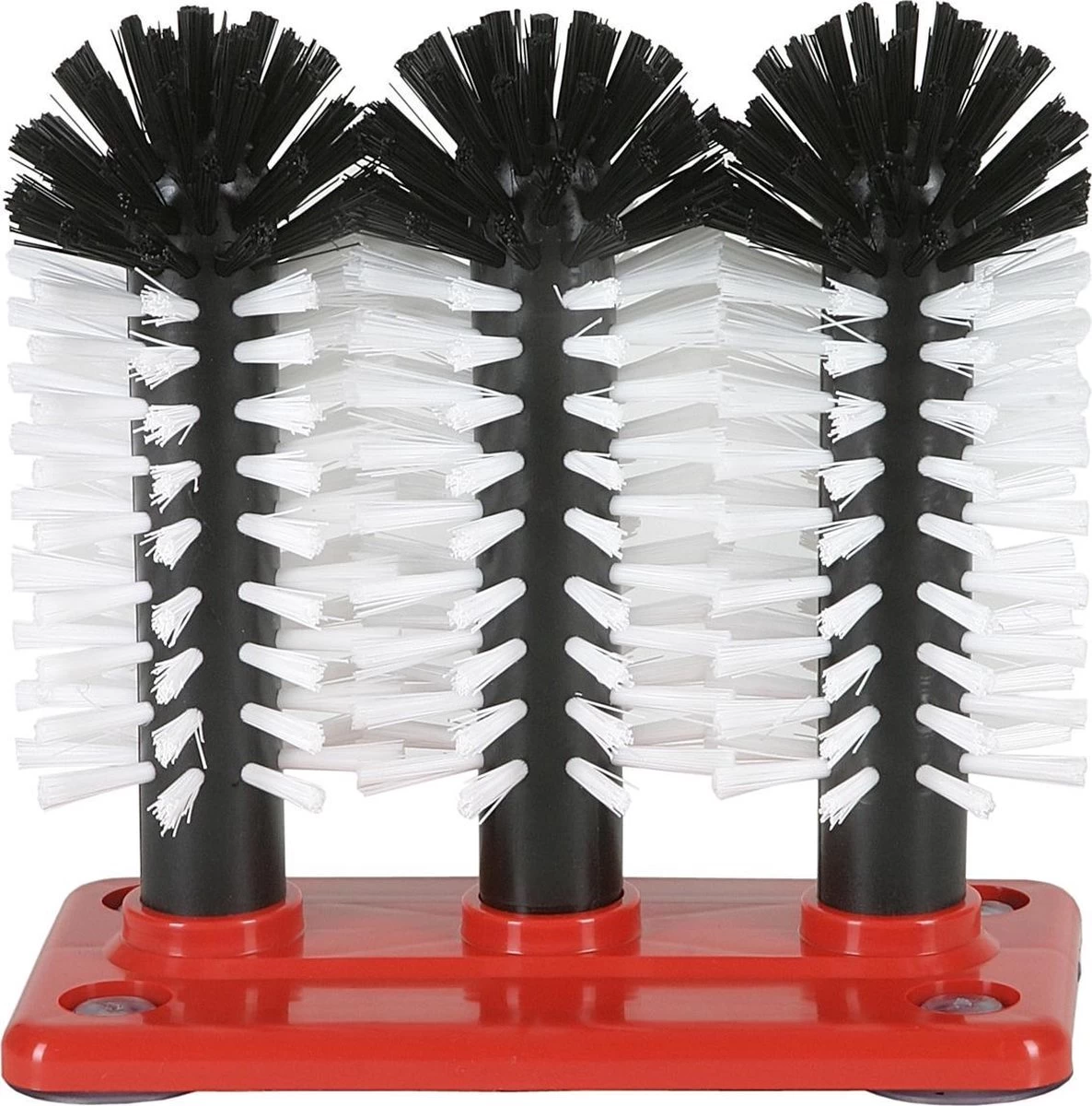 3-delige spoelborstel 18 cm hoog op stevige kunstof voet, met zuignappen aan de onderzijde zodat de spoelborstels goed vast blijven zitten in de spoelbak.
