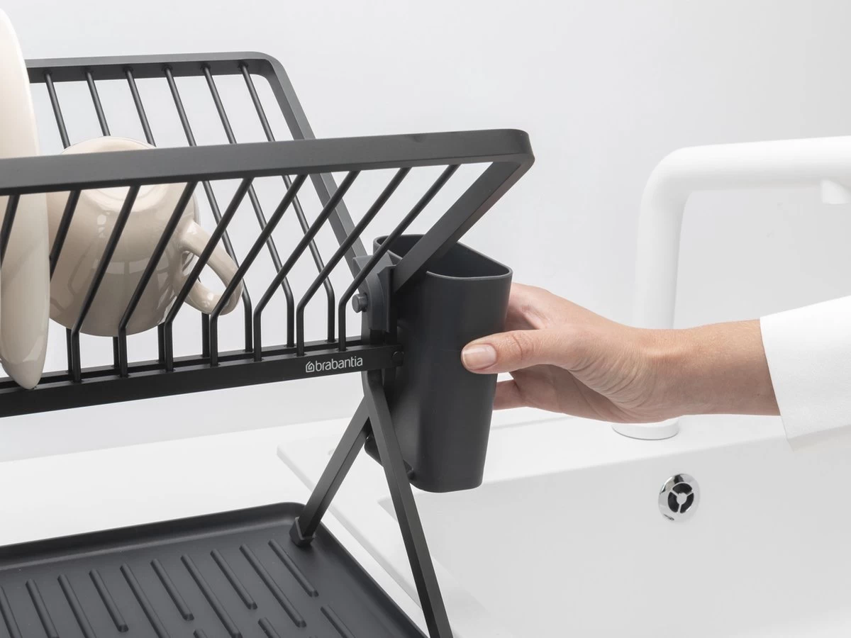 Op dit inklapbare Brabantia Sink Side Afdruiprek – Compact – Dark Grey met lekbak kun je al je borden, pannen en glazen kwijt. Het bakje voor bestek en keukengerei is afneembaar. Handig voor transport en bij het inklappen en opruimen van het rek. Een lekker rek dus, mooi genoeg om op je aanrecht te laten staan, maar ook makkelijk en klein op te bergen.