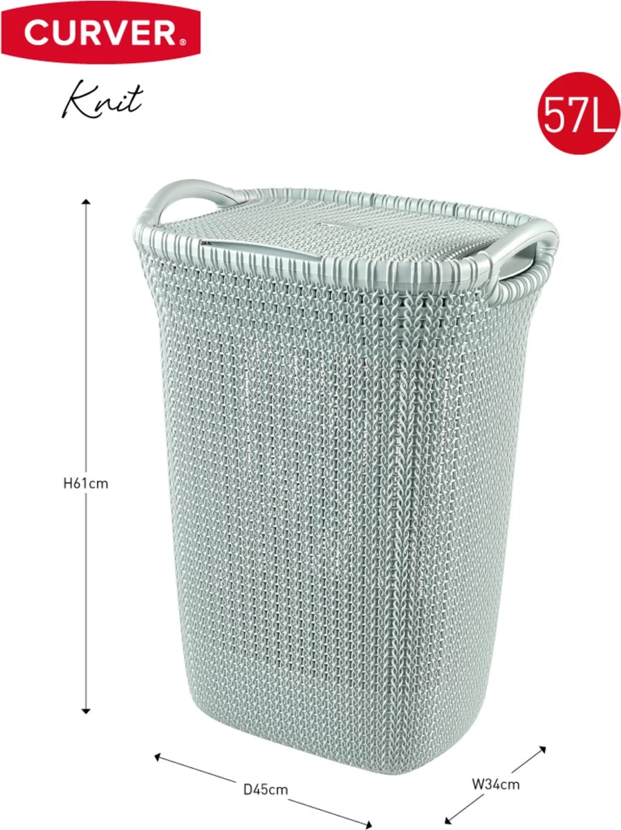De Curver Knit wasbox 57L is erg geschikt om vuile was in te verzamelen voordat het in de wasmachine gaat. Dit komt mede door de gebreide structuur waardoor de box ventileerd en luchtdoorlatend is. Het deksel opent tot 270 graden, hierdoor wordt het wel erg gemakkelijk om vuile was in- en uit te laden. Met zijn comfortable handgrepen is de box gemakkelijk te verplaatsen binnen huis. De Knit wasbox is goed te combineren met de Knit wasmand. Laat de Knit trend niet aan je voorbij gaan! Knit, net even anders!