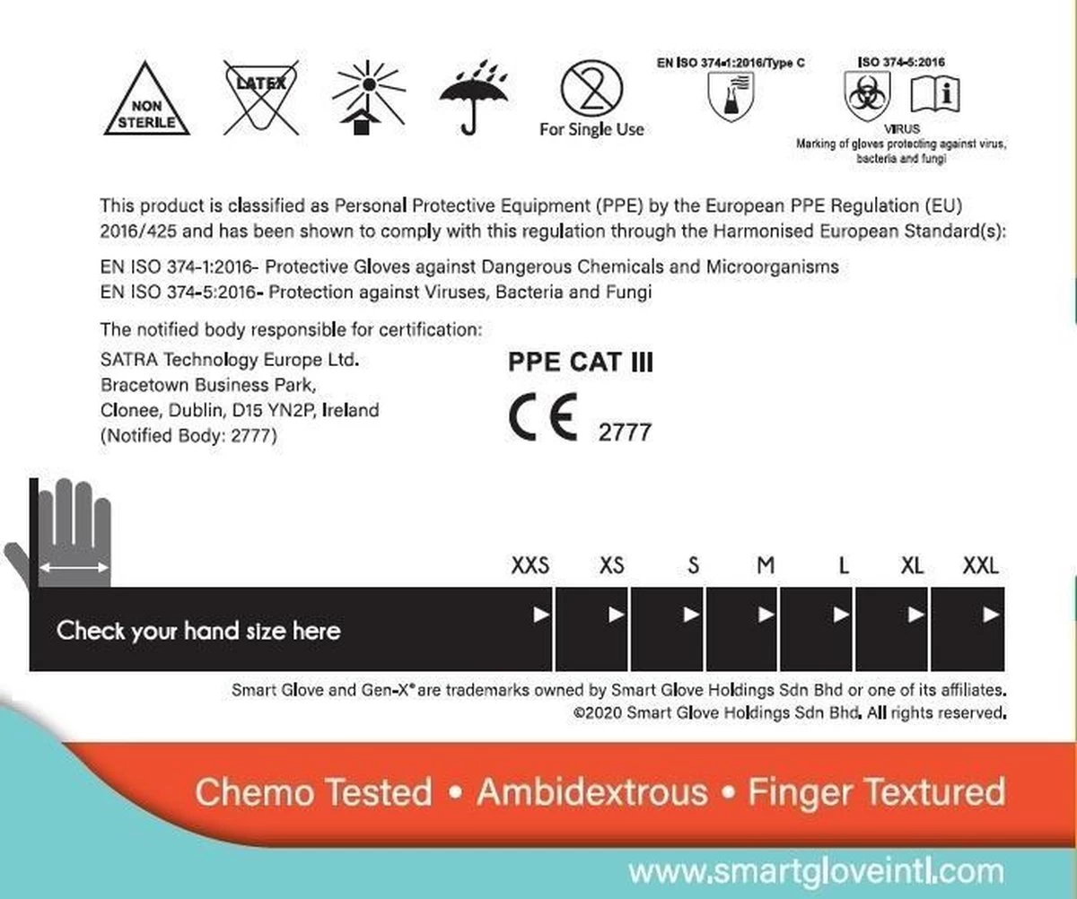 Al onze nitril handschoenen voldoen uiteraard aan de Europese Richtlijnen voor Medische Hulpmiddelen en Persoonlijke beschermingsmiddelen. De kwaliteit van de handschoenen wordt gecontroleerd op basis van de AQL-methode (Niveau 1.5). De handschoen heeft een uitstekende grip in de vingertoppen.