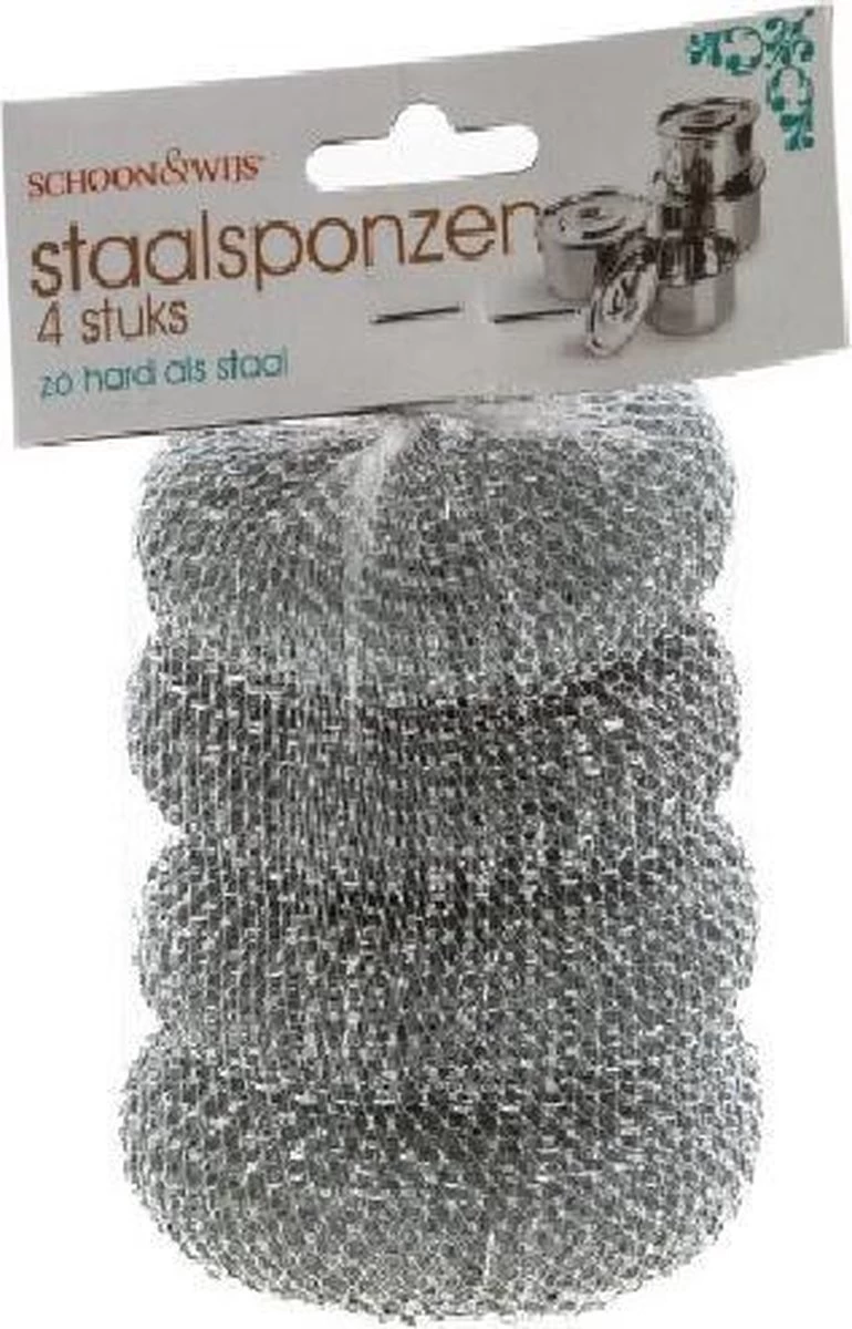 Deze RVS metaalspons is onmisbaar in elke huishoudelijke of industriële keuken. De schuurspons maakt het oppervlak grondig schoon zonder vlekken achter te laten. Deze spons heeft een zeer krachtig, schurend effect zodat alles weer zal stralen. Het product is zilver van kleur, gemaakt van metaal en wordt geleverd in een pakket van 4 stuks.